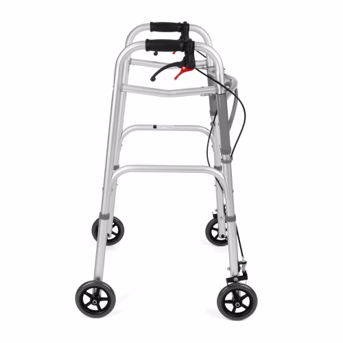 - 1. Wersja czterokołowa: Idealna dla płynnego i swobodnego poruszania się bez konieczności podnoszenia balkonika. Zapewnia maksymalną mobilność na dłuższych dystansach.