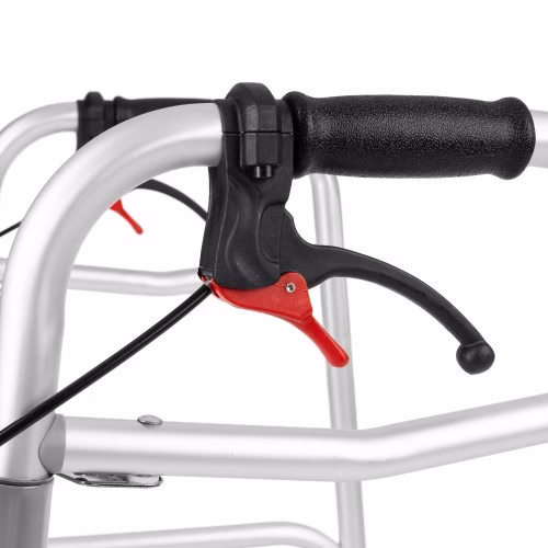 - Hamulce z blokadą postojową: Ergonomiczne hamulce umieszczone przy uchwytach pozwalają na łatwe zwalnianie i zatrzymywanie balkonika. Wciśnij je w dół, aby aktywować blokadę postojową, która całkowicie unieruchamia balkonik – jest to idealne i bezpieczne rozwiązanie podczas odpoczynku, wstawania czy siadania.