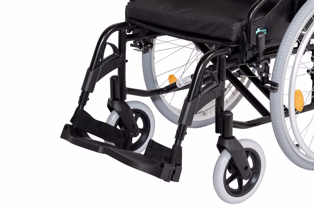 Wózek wyposażono w szybkozłącza tylnych kół, co ułatwia demontaż kół bez narzędzi i skraca czas przygotowania do przewozu. Dodatkowe hamulce dla opiekuna zwiększają kontrolę nad wózkiem podczas jazdy i postoju, podnosząc bezpieczeństwo w codziennych sytuacjach. Komfort zapewniają uchylne boczki, regulowane podnóżki oraz poduszka piankowa z pasem biodrowym, wspierające stabilną pozycję siedzącą.